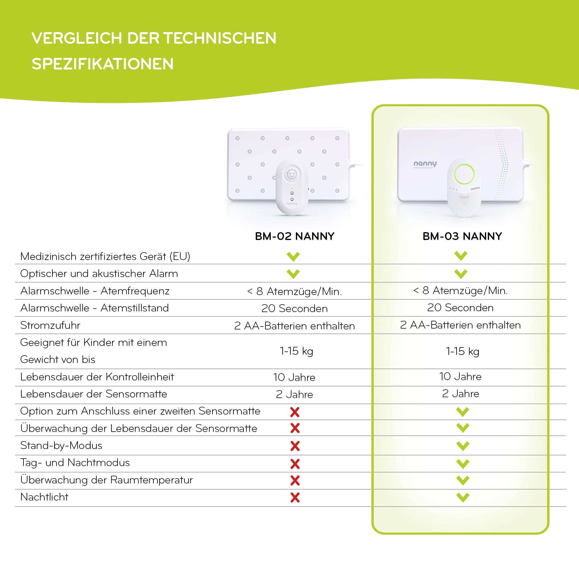 Seit vielen Jahren gehört der Nanny BM-02 zu den beliebtesten Atemmonitoren für Babys. Hunderttausende Familien setzen ihn bereits ein – zuverlässig, unkompliziert und vielfach bewährt. Nun bekommt er mit dem BM-03 ein modernes Geschwistermodell, das auf der geprüften Grundlage des BM-02 aufbaut und zusätzliche Komfortfunktionen bietet. Dieser Artikel zeigt übersichtlich, worin sich beide Geräte unterscheiden – und welches Modell zu welchen Bedürfnissen passt.